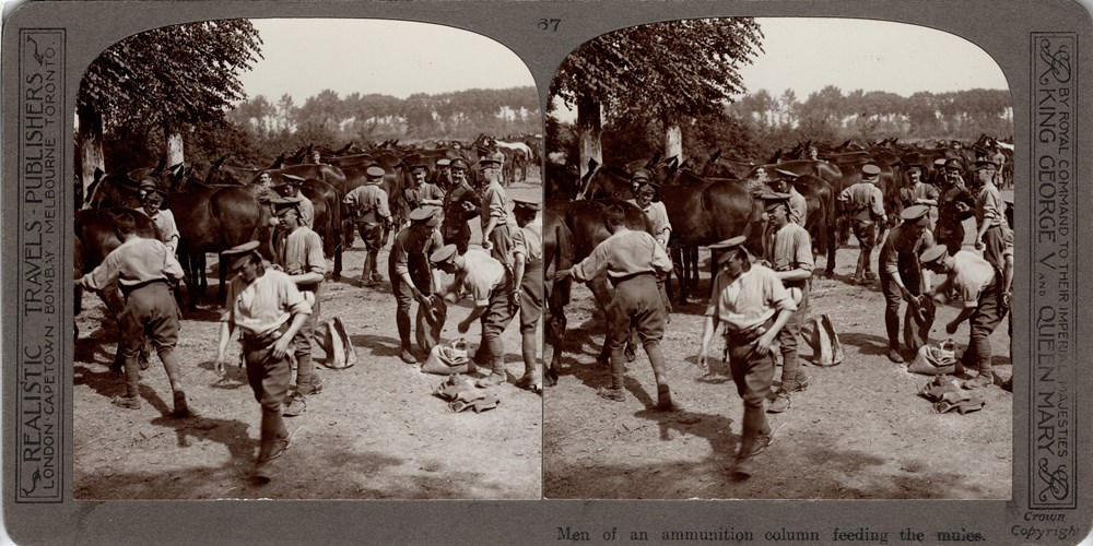 Men of an ammunition column feeding the mules.