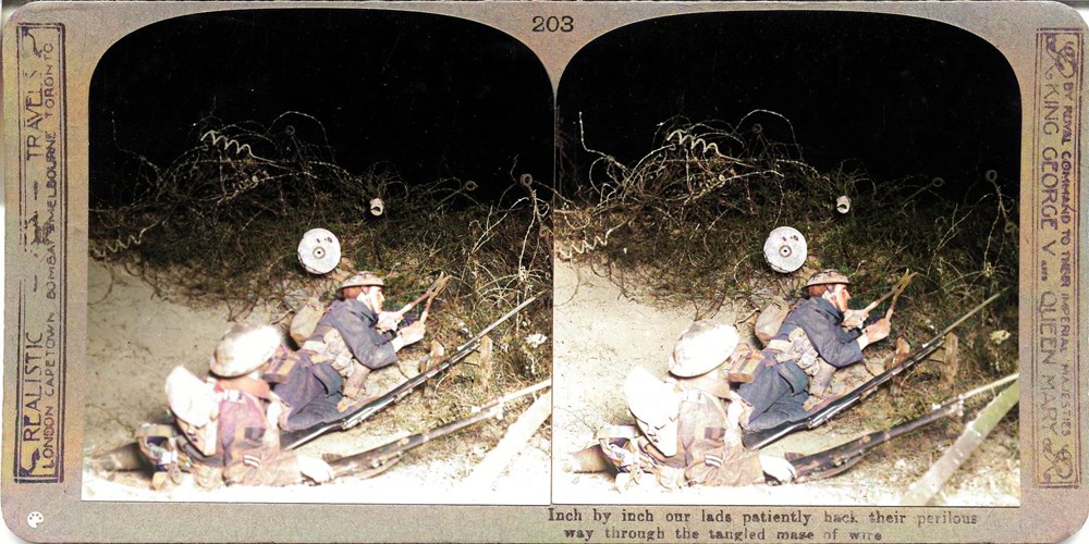 Tue, 27/07/2021 16:45One of a series of photos taken in 1915. Girdwood was allowed a party of Leicesters (who were resting behind the lines) together with German uniforms and props such as smoke bombs and a stretcher to make a series of stereo images. These were taken on a former battlefield, and as such create a more realistic image. The actual staging and captions are representative of actions from real battles that would have been impossible to photograph. Note that although the action is completely ‘staged’ there are no actors here.