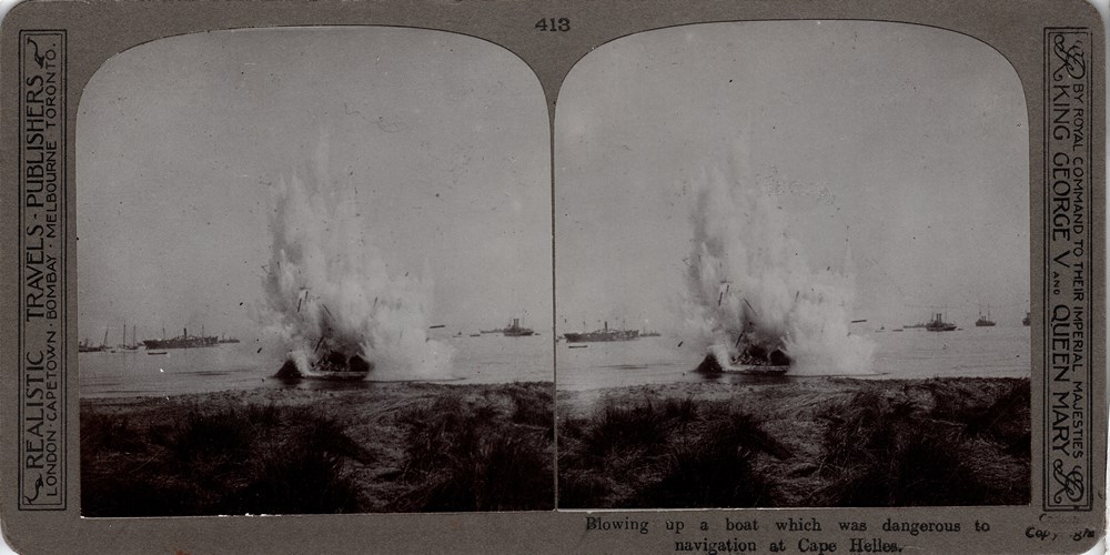 A well-prepared explosion - the camera would need carefull operation to get this image, definetly not due to shelling or hitting a mine.Image Id: 4457 Contributor: The Jordan/Ference Collection Theatre: The High Seas Subject: Surface Vessels Location: Unknown Regiment: Unknown Service Arm: Navy Battle: Unknown Date: Unknown Combatants: Unknown Publisher: Realistic Travels Source: British Directory: Phase 1 601-700 WFA