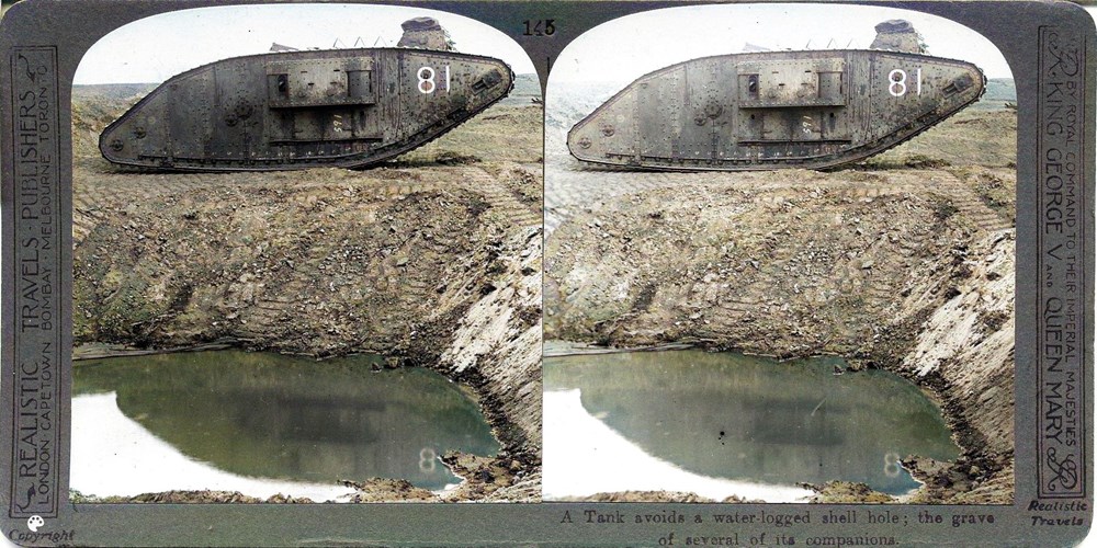 A tank avoids a water-logged shell hole; the grave of several of its companions.