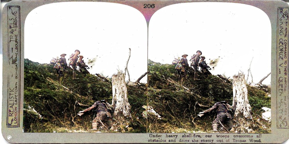Under heavy shell-fire, our troops overcome all obstacles and drive the enemy out of Trones Wood