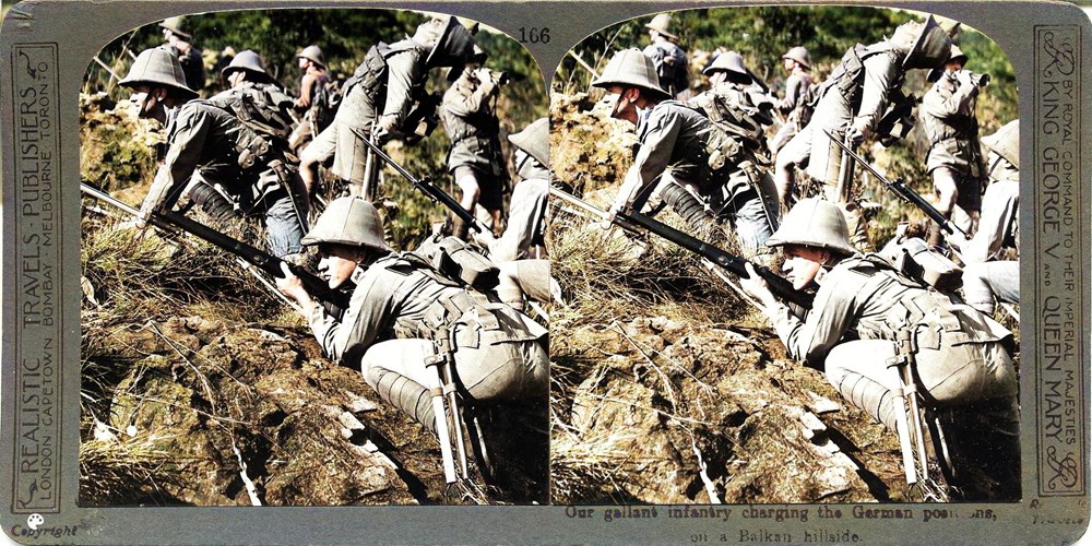 Our gallant infantry charging the German positions, on a Balkan hillside.