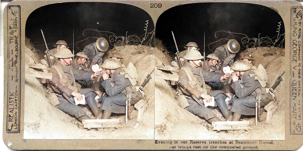 Evening in our Reserve trenches at Beaumont Hamel; our troops rest on the conquered ground