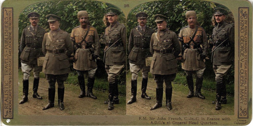 From left to right, Hon. J.Dawnay, Sir John French, Sirdar Bahardur Khwaja Mahomed and Major Watt.Image Id: 4521 Contributor: The Jordan/Ference Collection Theatre: Western Front Subject: The High Command Location: Belgian Flanders Regiment: Unknown Service Arm: Unknown Battle: Unknown Date: 18-August-1915 Combatants: British Publisher: Realistic Travels Source: British Directory: Phase 1 601-700 WFA