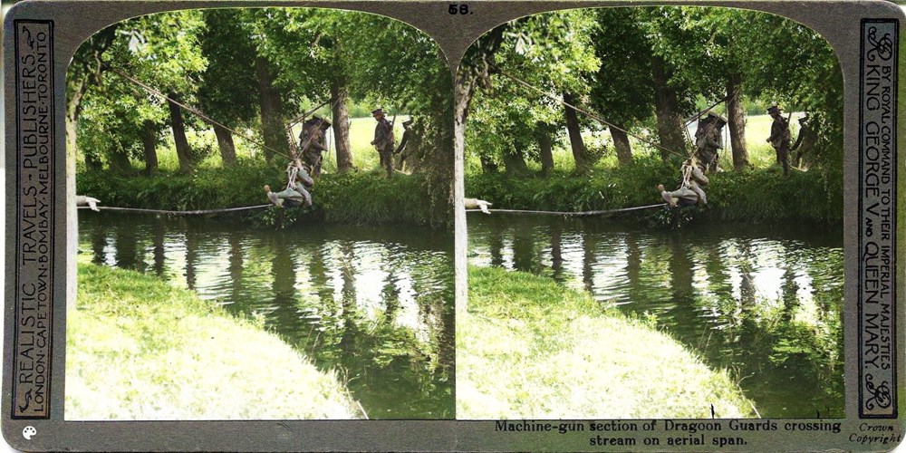Machine-gun section of Dragoon Guards crossing stream on [an] aerial span.