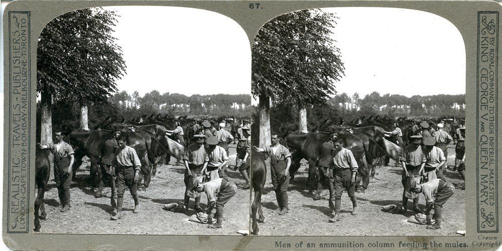 Men of an ammunition column feeding the mules.
