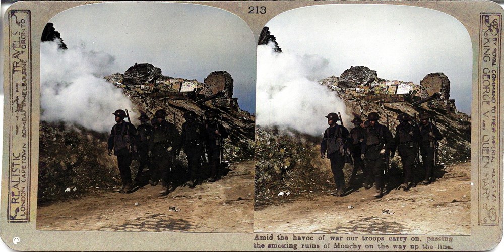 Amid the havoc of war our troops carry on, passing the smoking ruins of Monchy on the way up the line