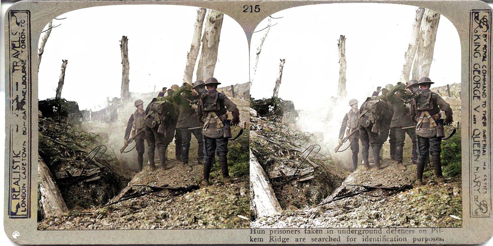 Hun prisoners taken in underground defences on Pilkem Ridge are searched for identification purposes