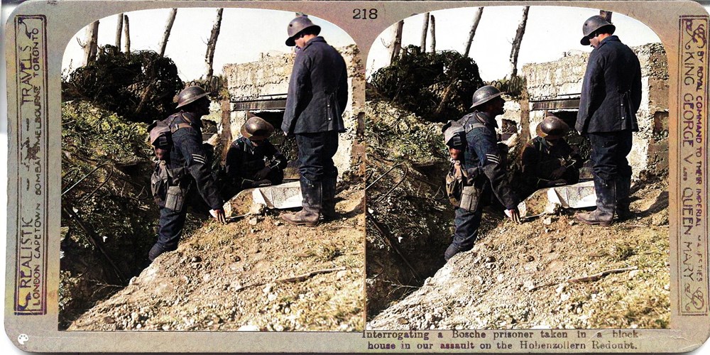 Interrogating a Bosche prisoner taken in a block house in our assault on the Hohenzollern Redoubt