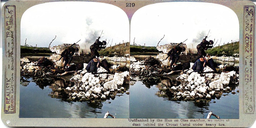 Outflanked by the Hun on Oise marshes, we retire at dusk behind the Crozat Canal under heavy fire