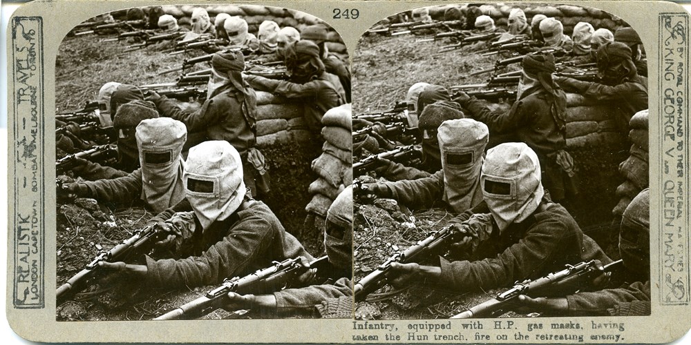 Infantry, equipped with H.P. gas masks having taken the Hun trench, fire on the retreating enemy