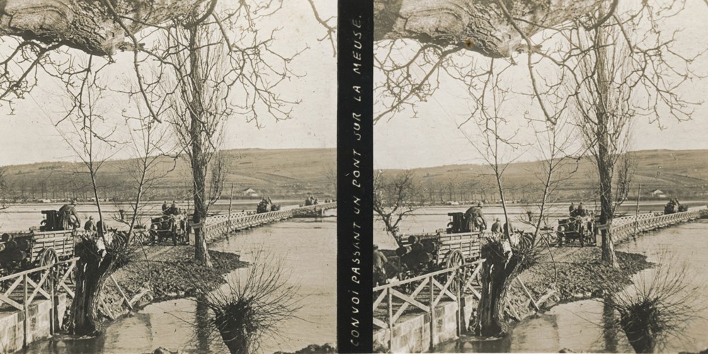 convoi passant un pont sur la Meuse - convoy crossing a bridge over the Meuse