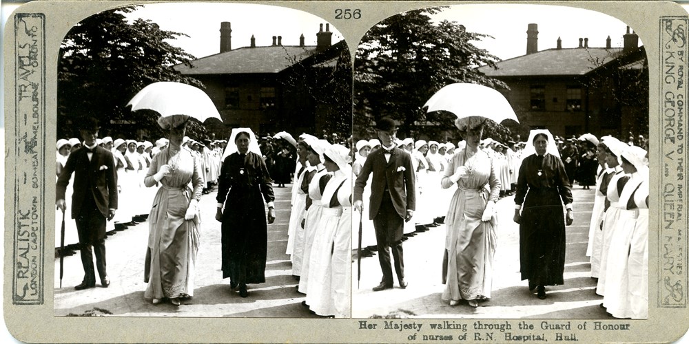 Her majesty walking through the Guard of Honour of nurses of R.N. Hospital, Hull