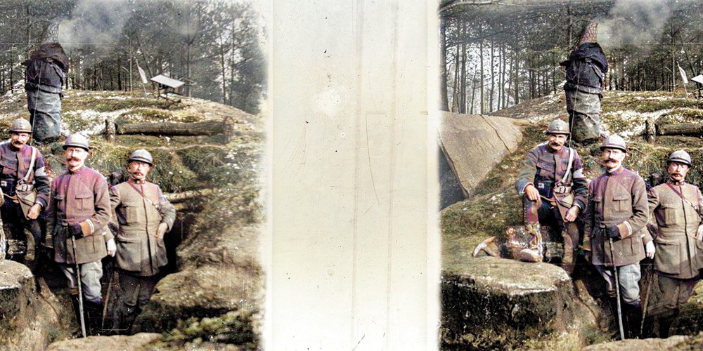 Three poilu posing for the camera in the trench above the Villa Viviane Dugour