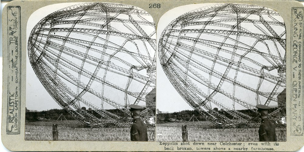 Zeppelin L33 shot down near Colchester, even with its back broken, towers above nearby farmhouse.