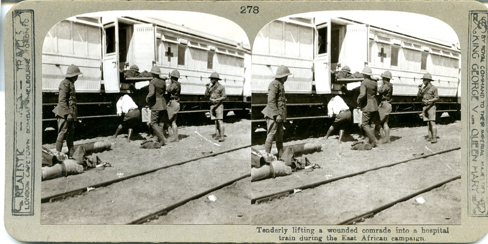 Tenderly lifting a wounded comrade into a hospital train during the East African campaign