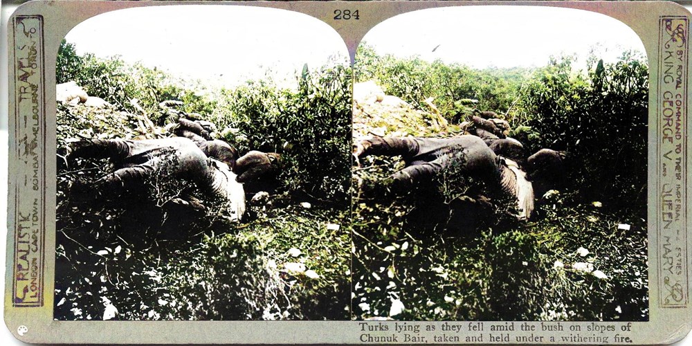 Turks lying as they fell amid the bush on slopes of Chunuk Bair, taken and held under a withering fire