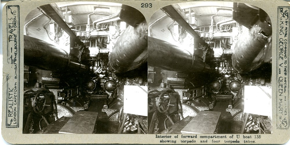 Interior of forward compartment of U boat 135 showing torpedo and four torpedo tubes