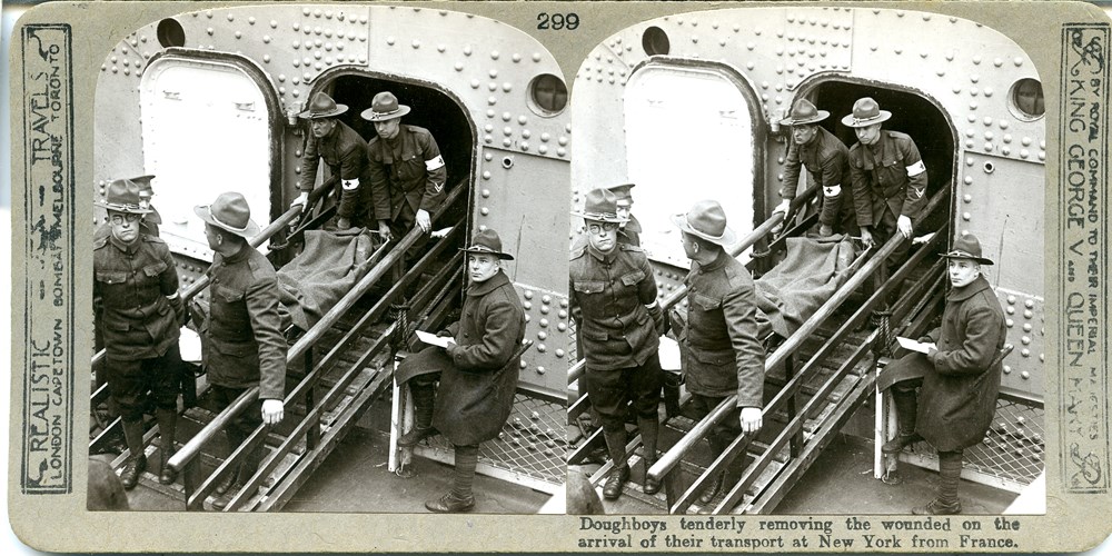 Doughboys tenderly removing the wounded on the arrival of their transport at New York from France