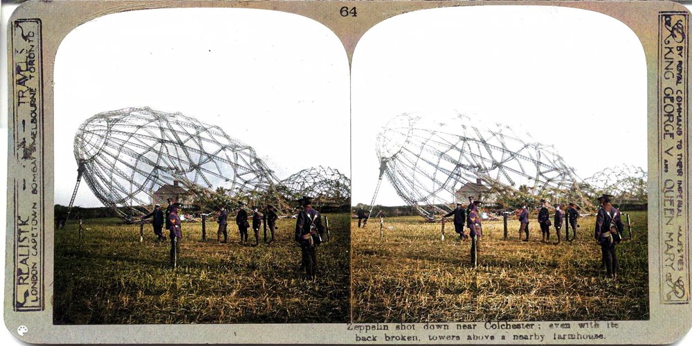 Zeppelin shot down near Colchester; even with its back broken, towers above nearby farmhouse