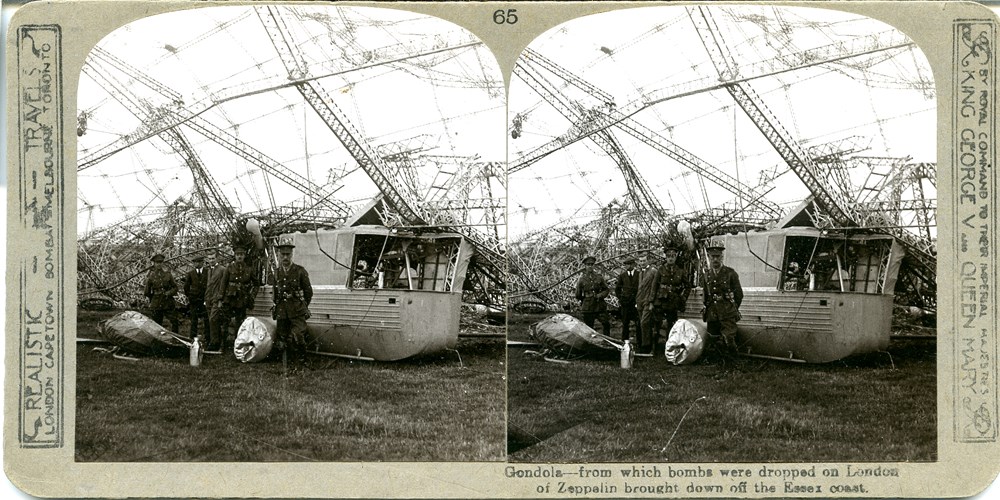 Gondola of Zeppelin raider which dropped bombs on London, brought down near the Essex coast