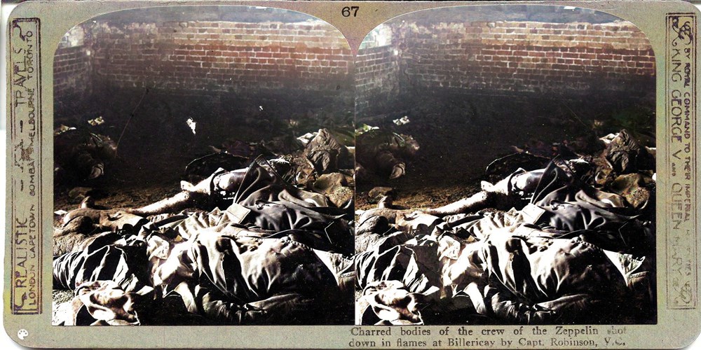 Charred bodies of Zeppelin crew shot down in flames at Billericay by Capt. Robinson, V.C.