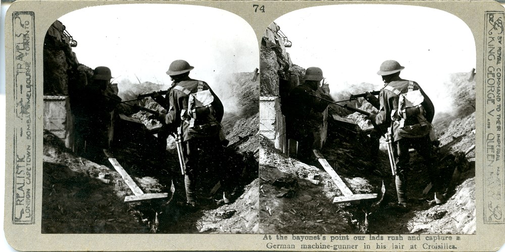 At the bayonet's point our troops surprise a Jerry machine gunner in his den at Croiselles