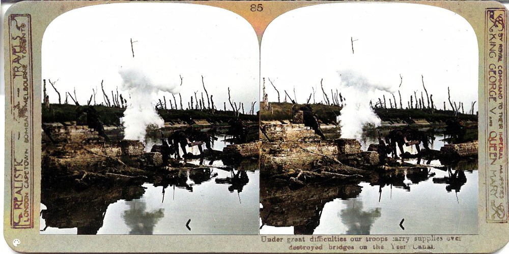 Under frightful difficulties, our troops carry supplies over destroyed bridges on Yser Canal