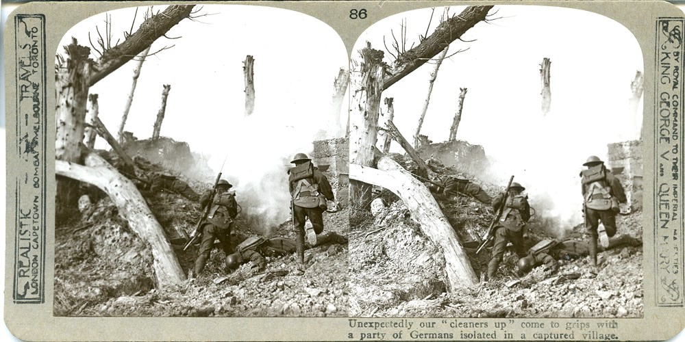 Tue, 27/07/2021 16:51One of a series of photos taken in 1915. Girdwood was allowed a party of Leicesters (who were resting behind the lines) together with German uniforms and props such as smoke bombs and a stretcher to make a series of stereo images. These were taken on a former battlefield, and as such create a more realistic image. The actual staging and captions are representative of actions from real battles that would have been impossible to photograph. Note that although the action is completely ‘staged’ there are no actors here.