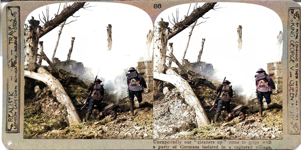 Tue, 27/07/2021 16:51One of a series of photos taken in 1915. Girdwood was allowed a party of Leicesters (who were resting behind the lines) together with German uniforms and props such as smoke bombs and a stretcher to make a series of stereo images. These were taken on a former battlefield, and as such create a more realistic image. The actual staging and captions are representative of actions from real battles that would have been impossible to photograph. Note that although the action is completely ‘staged’ there are no actors here.