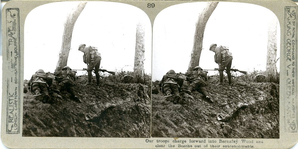 Tue, 27/07/2021 16:52One of a series of photos taken in 1915. Girdwood was allowed a party of Leicesters (who were resting behind the lines) together with German uniforms and props such as smoke bombs and a stretcher to make a series of stereo images. These were taken on a former battlefield, and as such create a more realistic image. The actual staging and captions are representative of actions from real battles that would have been impossible to photograph. Note that although the action is completely ‘staged’ there are no actors here.