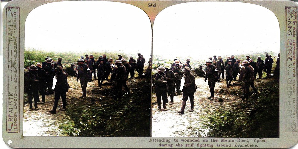 Attending to wounded on the Menin road, Ypres, during strenuous struggles around Zonnebeke
