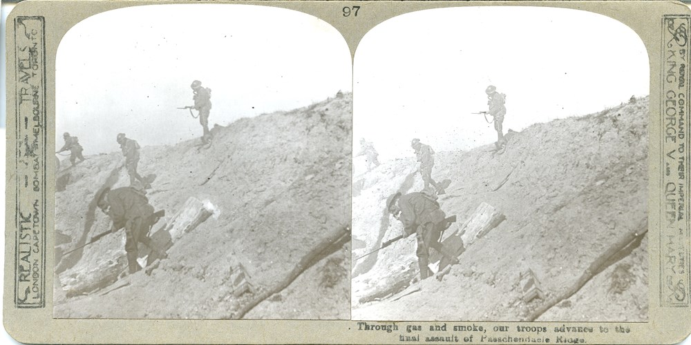 Through smoke and gas, our infantry advance to the final assault of Passachendaele (sic) Ridge