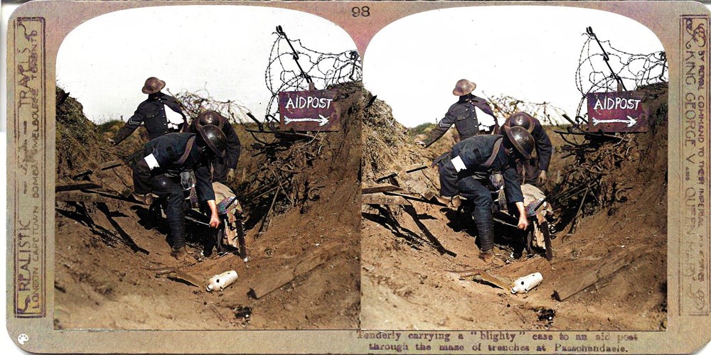 Tenderly carrying a "blighty" case to an aid post through maze of trenches, Passachendaele (sic)