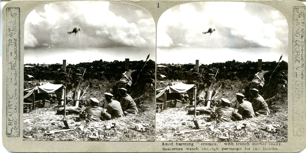 Amid bursting crumps, with trench mortar ready, Seaforths watch through periscope for the Hun