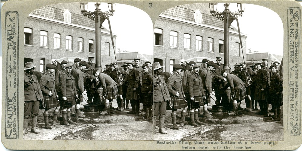 Seaforths fill their water bottles at the town pump La Gorgue, before going into the trenches