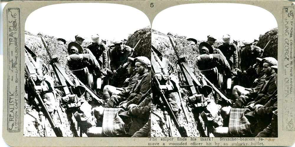 The sniper finds his mark! Stretcher-bearers remove an officer wounded by an unlucky bullet