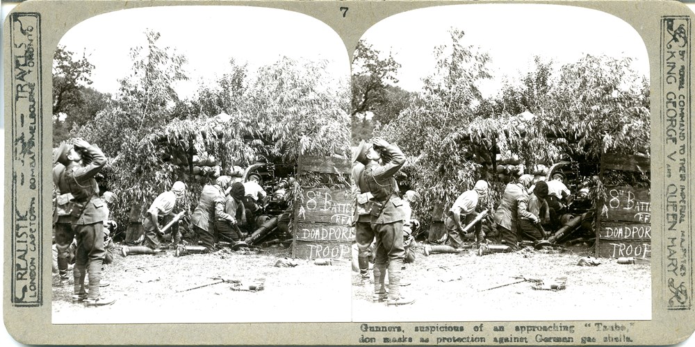Gunners, warned of an approaching Taube, don masks as protection against German gas shells