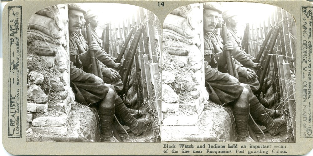 Image Id: 595 Contributor: The Jordan/Ference Collection Theatre: Western Front Subject: The Front Line Location: Unknown Regiment: Black Watch/ Dogra Service Arm: Infantry Battle: Unknown Date: 1915 Combatants: British/Indian Publisher: Realistic Travels Source: British Directory: Set of 600 001-100