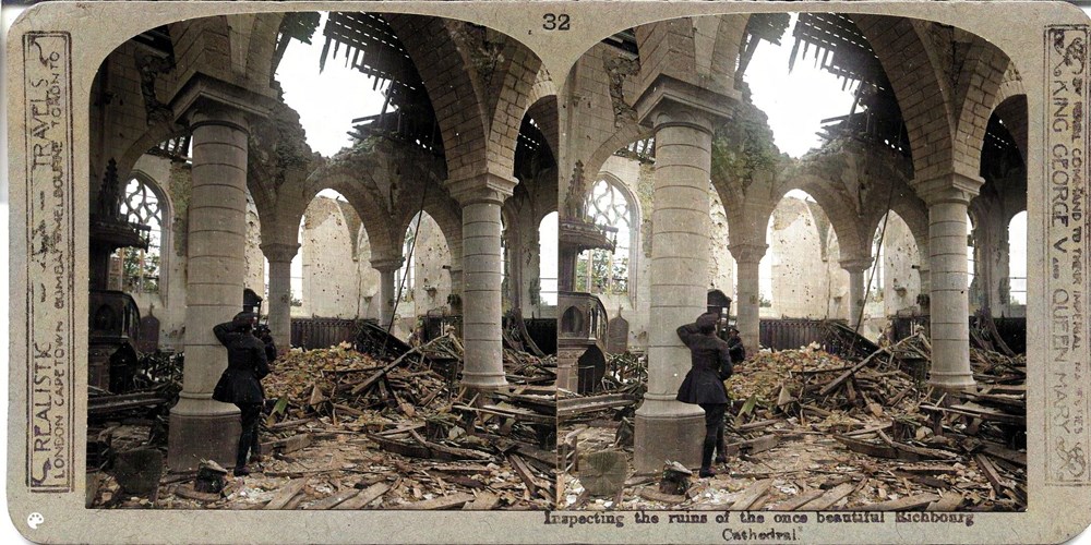 Pitiful ruins of the once-beautiful Richbourge Cathedral with gaping shell-holes in its roof