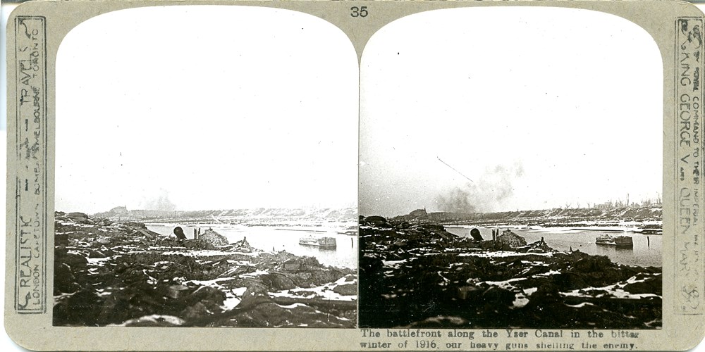 Battlefront along the Yser Canal in bitter winter of 1916, our heavy guns straf the enemy