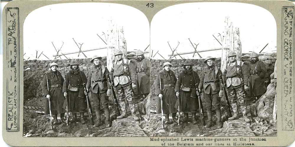 Mud-splashed Lewis machine gunners at junction of the Belgian and our lines at Hollebeke