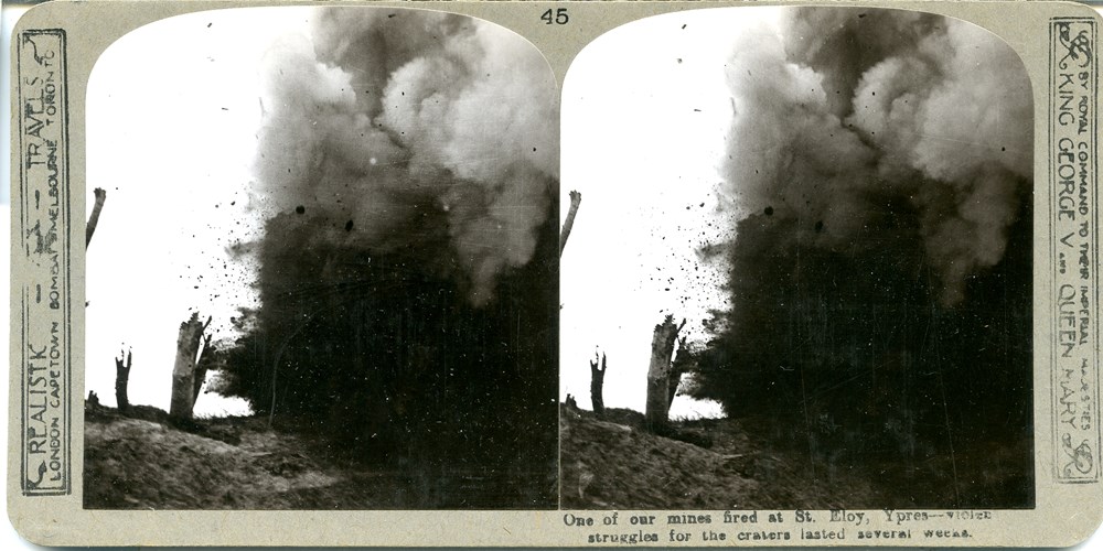 Our mine, fired during furious thrusts for St. Eloy, blots out a Jerry machine-gun nest, Ypres