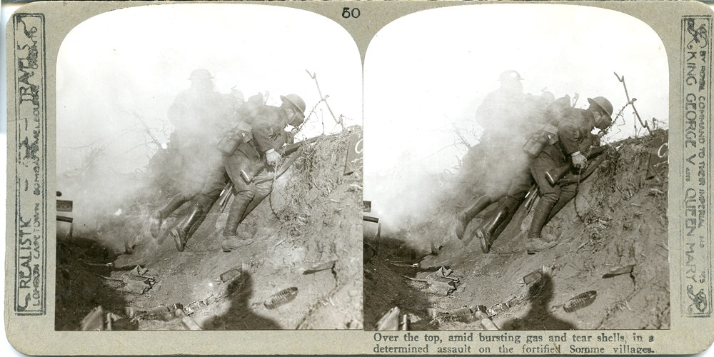 Over the top 'mid bursting gas and tear shells to storm the fortified villages on the Somme