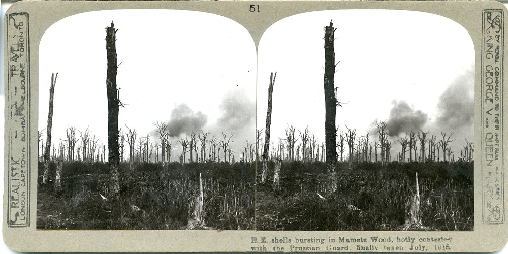 H.E.s bursting in Mametz Wood, hotly contested with Prussian Guards, finally taken July, 1916