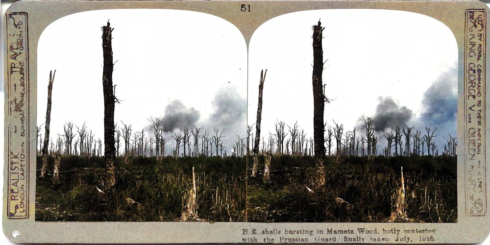 H.E.s bursting in Mametz Wood, hotly contested with Prussian Guards, finally taken July, 1916