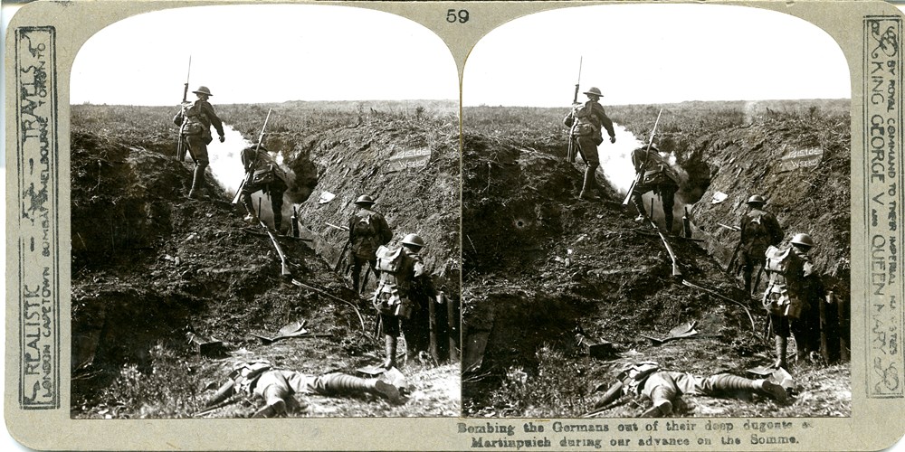 Bombing the Bosche out of their deep dug-outs near Martinspuich during our advance on Somme