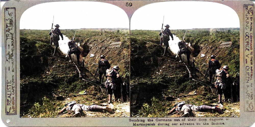 Bombing the Bosche out of their deep dug-outs near Martinspuich during our advance on Somme
