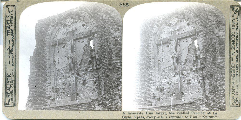 A favourite Hun target, the riddled Crucifix at La [Clyte], Ypres, every scar a reproach to Hun "Kultur"