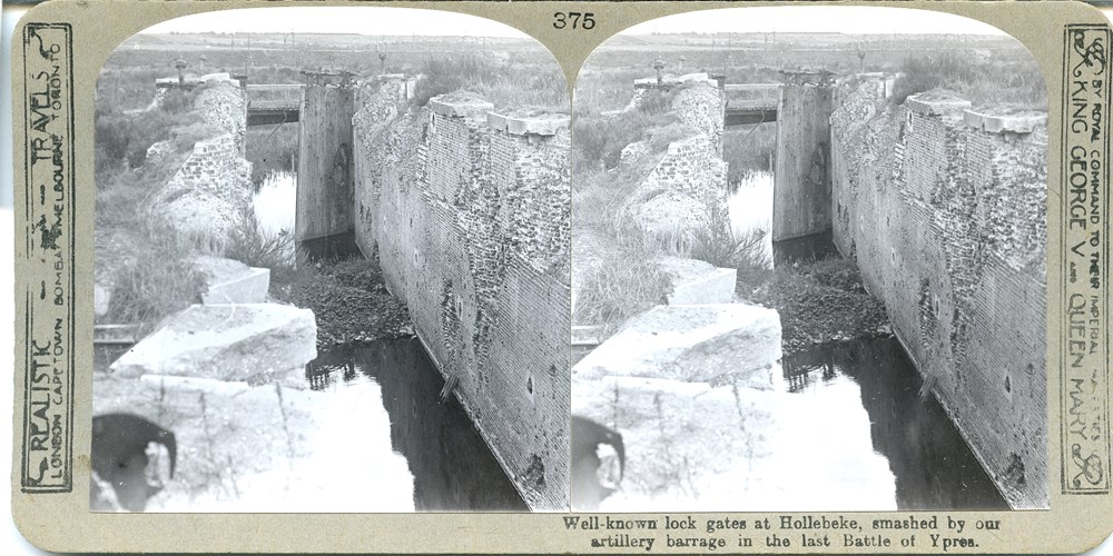 Well-known lock gates at Hollebeke, smashed by our artillery barrage in the last Battle of Ypres